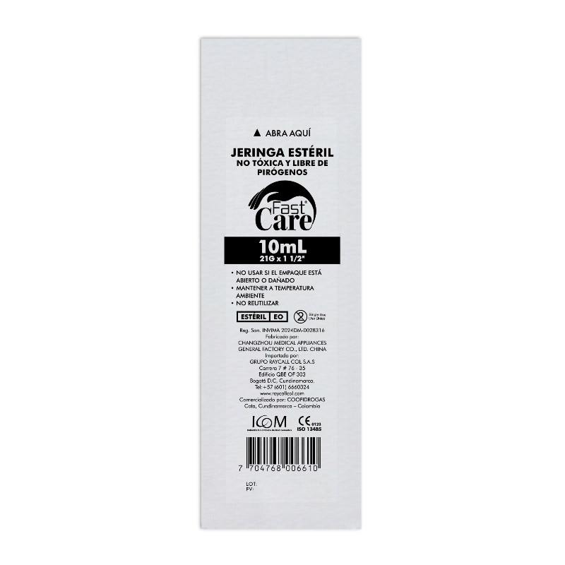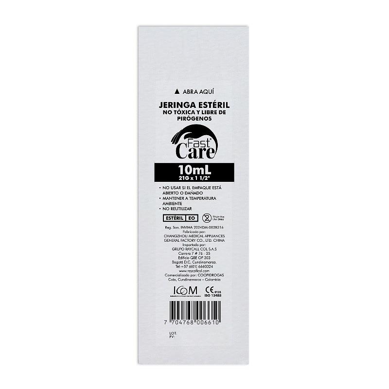 Jeringa de 10 ml de 3 partes con aguja 21G x 1½, estéril y desechable.